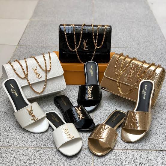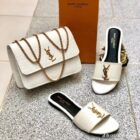 This chic combo features a pristine white textured YSL crossbody bag, perfectly paired with matching white slippers. Both pieces boast elegant gold accents and the iconic YSL logo, offering a sophisticated and cohesive look. The slippers are available in sizes 36-41.